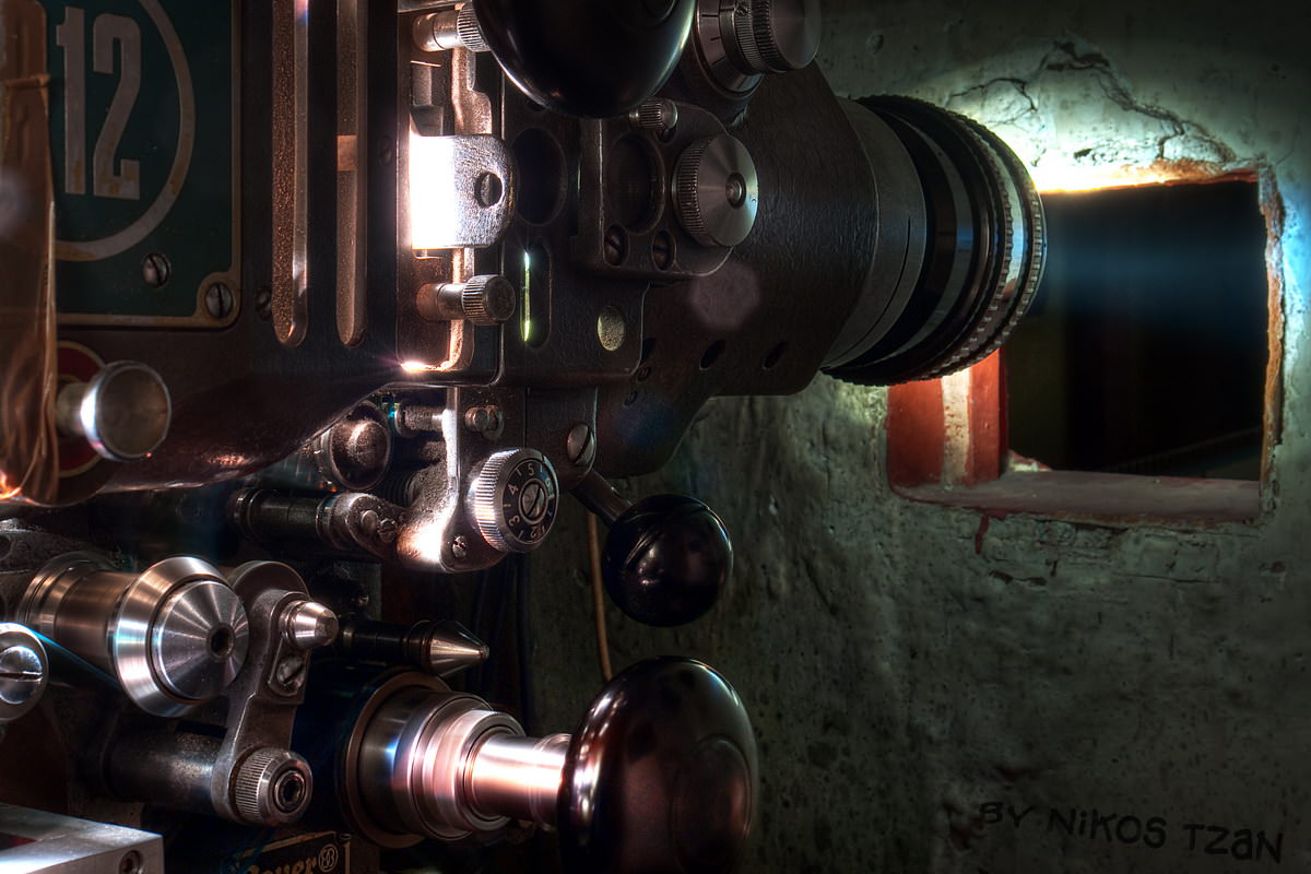Φωτογράφηση παλιάς μηχανής προβολής εν λειτουργία, στο δωμάτιο προβολής του κινηματογράφου. Η φωτογράφηση έγινε σε τρίποδο, με ειδική τεχνική που ονομάζεται HDR (High Dynamic Range) για να μπορέσουν να αποδοθούν σωστά οι μεγάλες διαφορές στη φωτεινότητα του κάδρου.