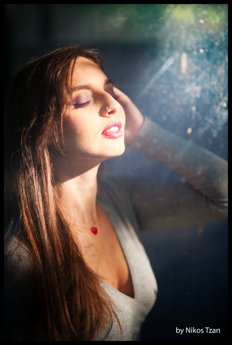 Φωτογράφιση πορτραίτου πίσω από τζάμι με κόντρα φως του ήλιου. Μοντέλο: Δέσποινα Πεπονίδου