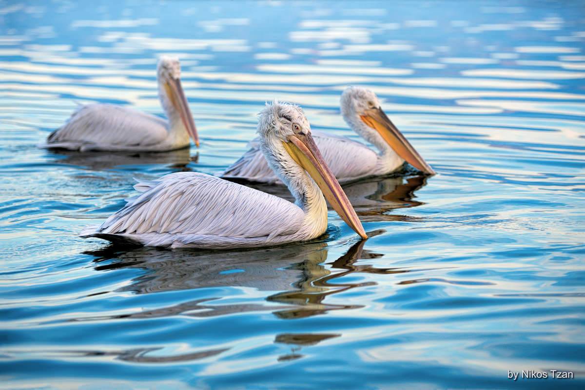 Φωτογράφιση αργυροπελεκάνου στο φυσικό του περιβάλλον. Η λήψη έγινε στην λίμνη Κερκίνη Σερρών με τα νερά να αντανακλούν τα υπέροχα μπλε χρώματα του ουρανού (και να στραβώνουν την υπέροχη μύτη του αργυροπελεκάνου).