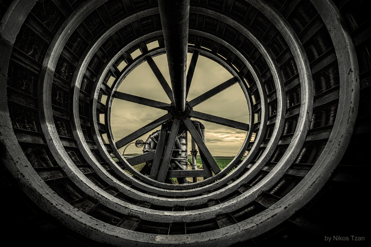 Πρωτότυπη και ιδιαίτερης αισθητικής φωτογραφία, μιας και η λήψη έγινε μέσα από ποτιστικό καρούλι για χωράφια. ————————– Στην πρώτη συνοδευτική φωτογραφία βλέπετε το καρούλι και το τοπίο γύρω του. Στην δεύτερη φωτογραφία, βλέπετε την τοποθέτηση της φωτογραφικής μηχανής πάνω στο σιδερένιο πλαίσιο. Κάντε κλικ πάνω στις φωτογραφίες, αν θέλετε να τις δείτε σε μεγάλο μέγεθος.