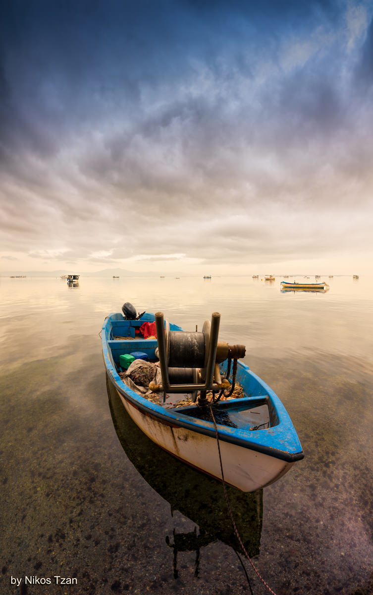 Small fishing boat Υπερευρυγώνια πανοραμική λήψη από ένα μαγευτικό τοπίο με υπέροχο ουρανό και μια μικρή ψαρόβαρκα που νομίζεις ότι αιωρείται στο καθαρό νερό.