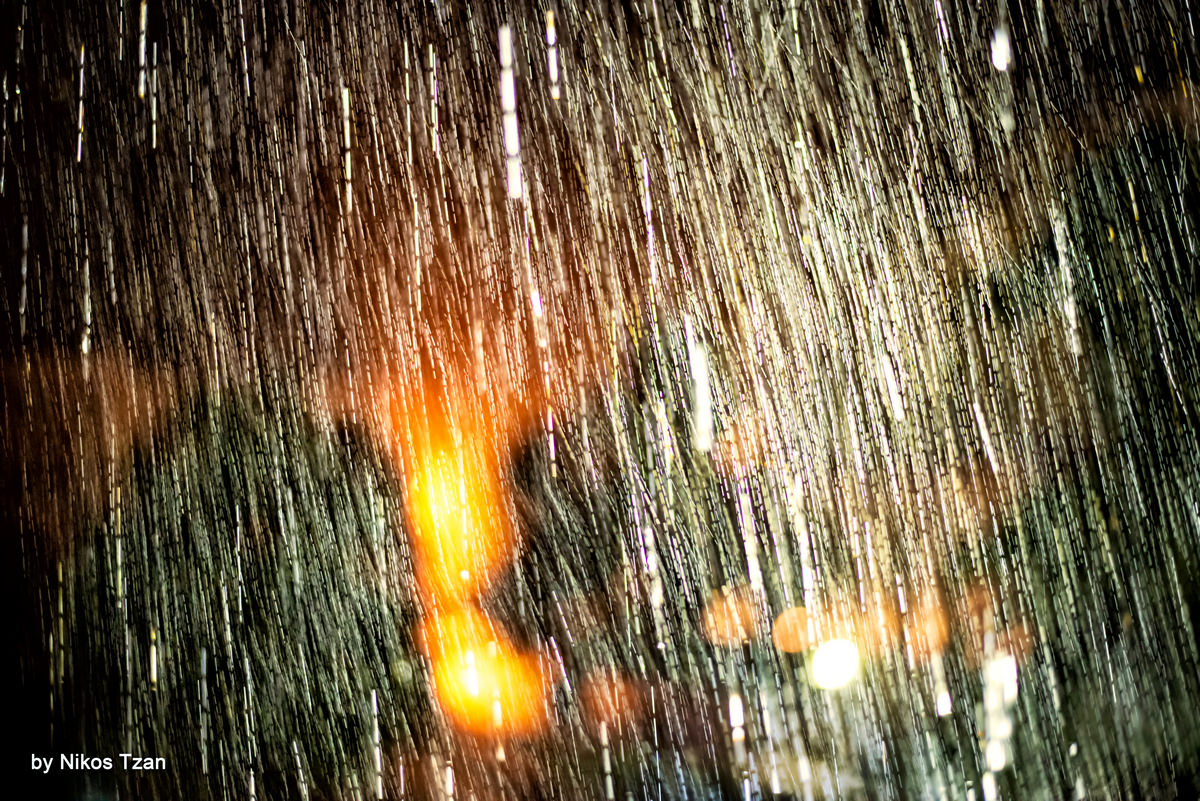 Νυχτερινή φωτογράφιση με εξαιρετικά δυνατή βροχή, που έθεσε σε κίνδυνο τον φωτογραφικό εξοπλισμό μου. Παρόλο που κρατούσα ομπρέλα και είχα rain cover στη φωτογραφική μου μηχανή, διαπίστωσα αργότερα ότι το νερό κατάφερε και πέρασε μέσα! Τέτοια περίπτωση, δεν ξαναέτυχα στην ζωή μου. Ευτυχώς, δράματα δεν είχαμε… (Να είναι καλά η Nikon, που φτιάχνει πολύ ποιοτικές…