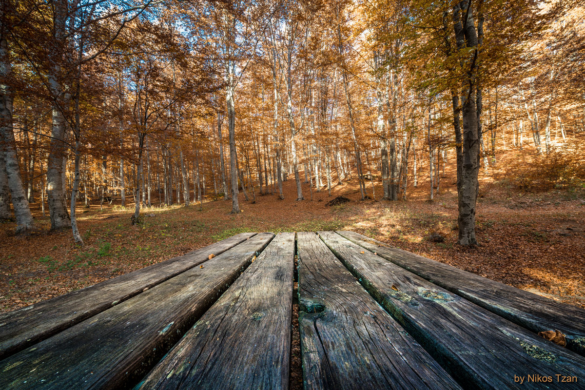 Φωτογράφιση τραπεζιού από ξύλινο παγκάκι στο βουνό Λαϊλιάς (στο Νομό Σερρών), με φόντο ένα υπέροχο τοπίο γεμάτο δέντρα με φθινοπωρινά χρώματα.