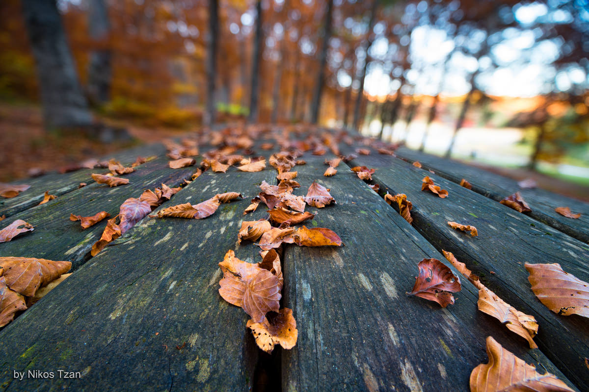Φωτογράφιση φθινοπωρινών φύλλων σε ένα τραπέζι από ξύλινο παγκάκι, στο βουνό Λαϊλιά Σερρών.