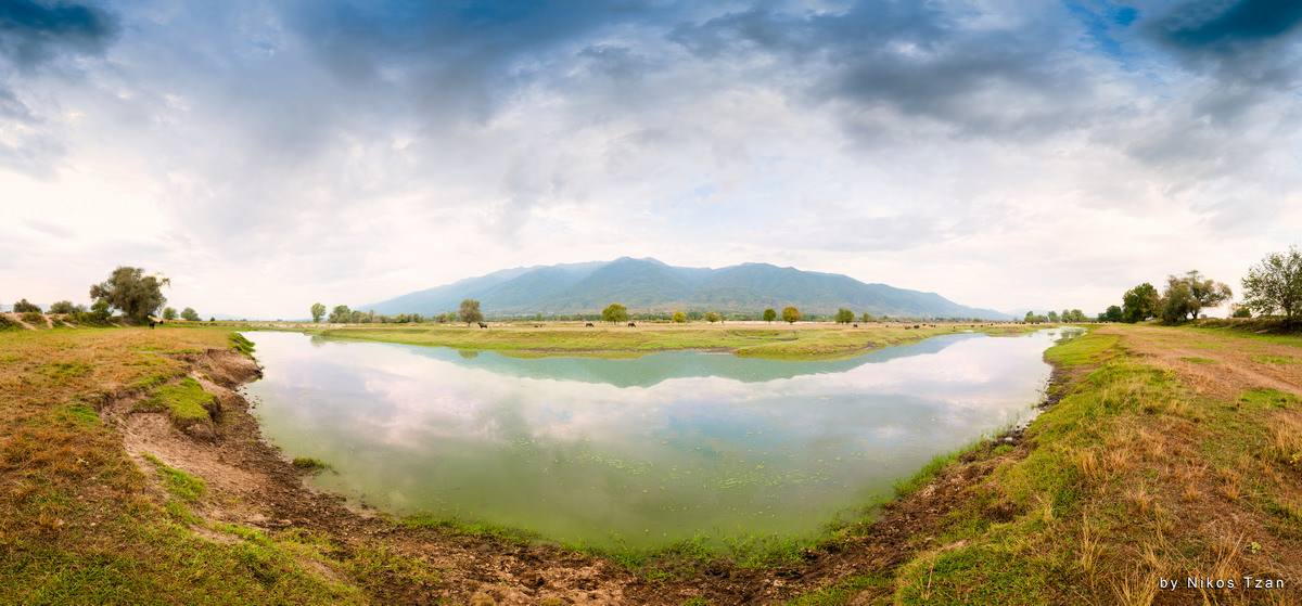 Πανοραμική λήψη του Στρυμόνα ποταμού, λίγο πριν την εκβολή του στη λίμνη Κερκίνη. Στο βάθος, μερικά βουβάλια βόσκουν ανέμελα. Πίσω πίσω, διακρίνεται το όρος Κερκίνη ή Μπέλες, ένα μακρόστενο βουνό που σχηματίζει μια απότομη κορυφογραμμή κατά μήκος των συνόρων της Ελλάδας με τη Βουλγαρία και τη FYROM
