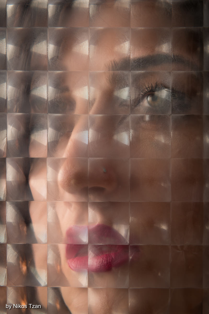Fragmented Φωτογράφιση καλλιτεχνικού πορτραίτου στο Studio, μπροστά από τετράγωνους μεγεθυντικούς φακούς. Μοντέλο: Ioanna Gayana
