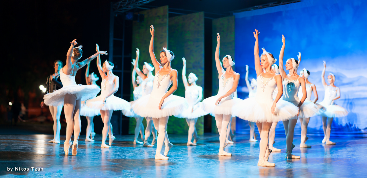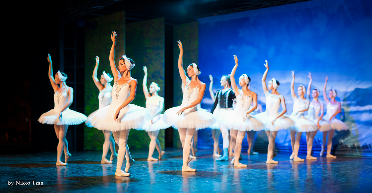Πανοραμική φωτογράφιση, από τη σκηνή της διάσημης χορευτικής παράστασης μπαλέτου “Η λίμνη των κύκνων”.