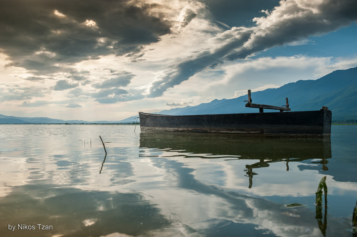 Φωτογράφιση από εξαιρετικά χαμηλό ύψος ενός υπέροχου τοπίου, με πρώτο θέμα μια παλιά ξύλινη βάρκα. Η λήψη έγινε στην λίμνη Κερκίνη (Νομός Σερρών).