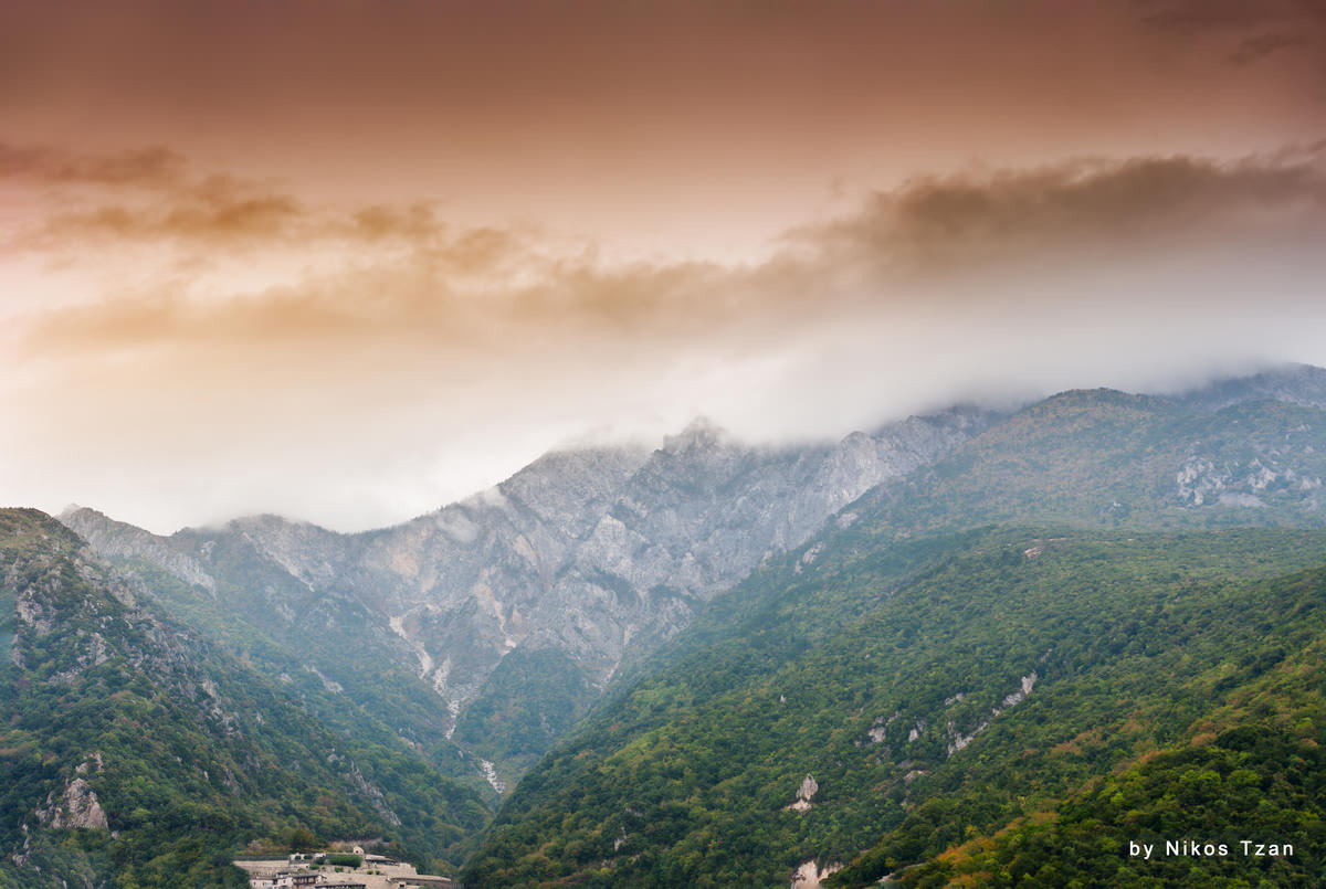 Πανοραμική λήψη από τη Σκήτη του Γέροντα Ιλαρίων, στο Άγιο Όρος.