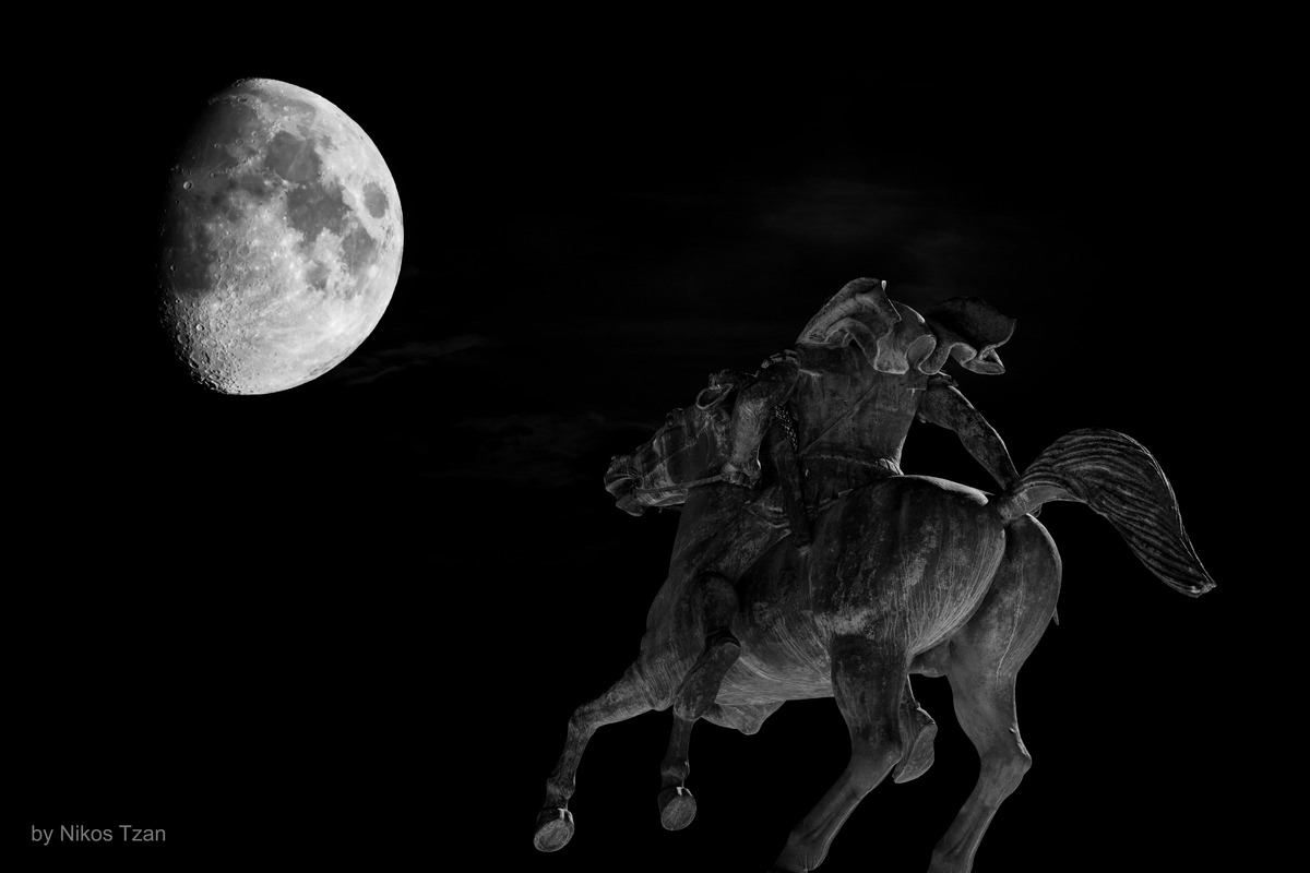 Νυχτερινή φωτογράφιση του αγάλματος του Μεγάλου Αλεξάνδρου δίπλα στον Λευκό Πύργο της Θεσσαλονίκης, με φόντο ένα σχεδόν ολόγιομο φεγγάρι.