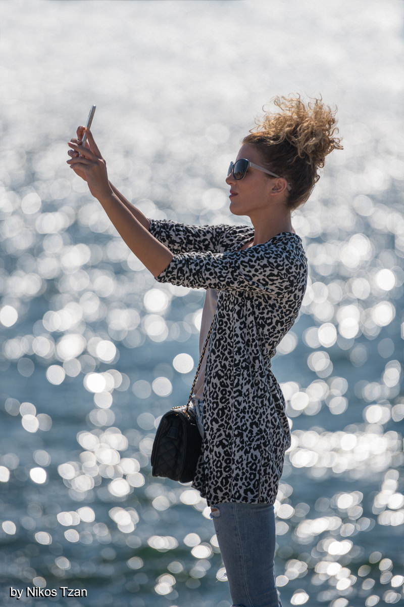 Πορτραίτο δρόμου στο λιμάνι της Θεσσαλονίκης, με φόντο τις αντανακλάσεις του ηλίου στη θάλασσα.