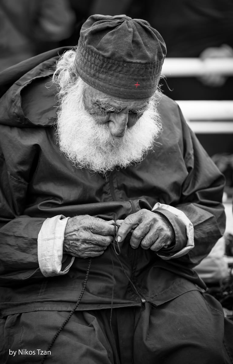 Πορτραίτο δρόμου ενός Γέροντα που έφτιαχνε με τα ροζιασμένα αλλά περίτεχνα χέρια του κομποσκοίνια.