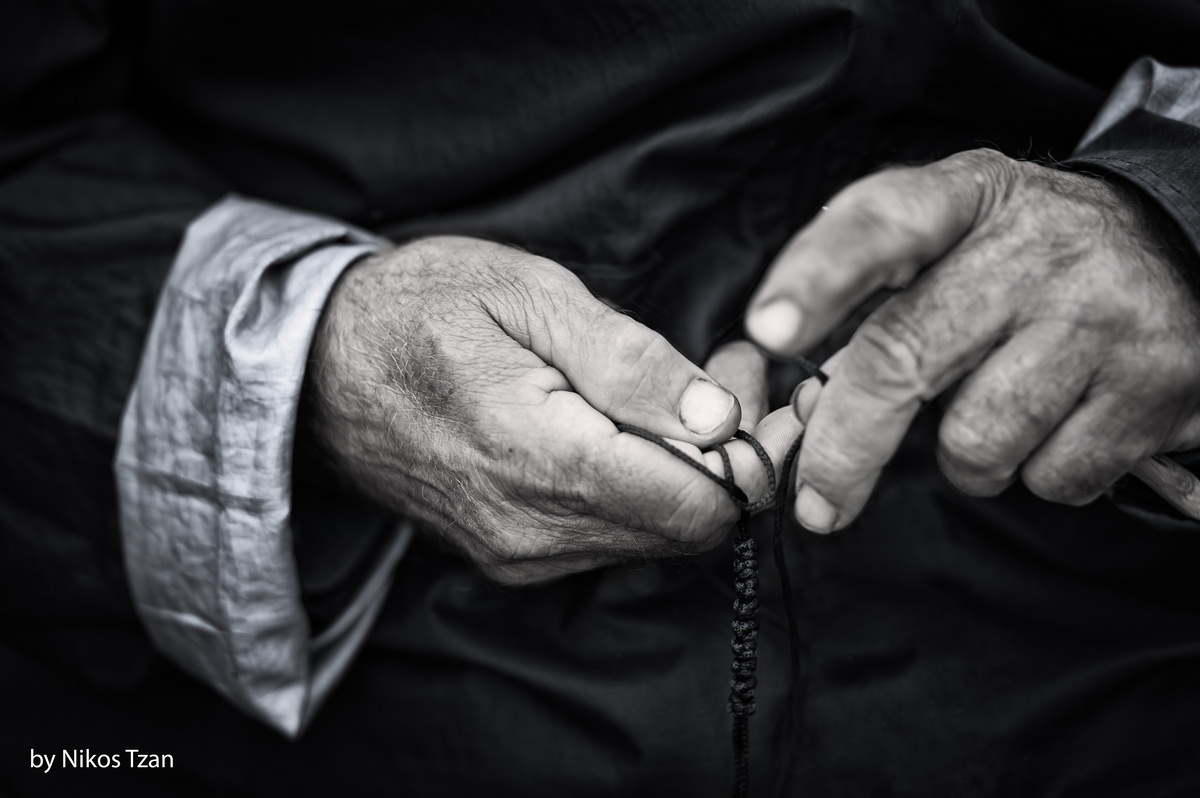 Κοντινή λήψη από τα ροζιασμένα αλλά περίτεχνα χέρια ενός Γέροντα που έφτιαχνε κομποσκοίνια.